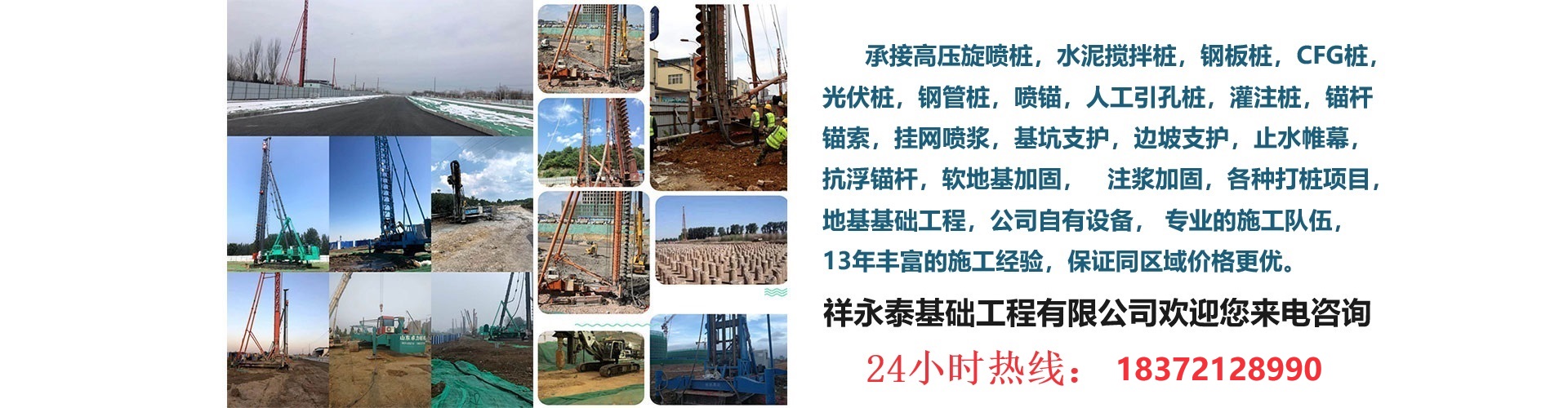 祥永泰基礎工程有限公司是一家專業(yè)從事公路路基、路面、管道及橋頭等軟地基加固的公司;我公司主營高壓旋噴樁施工,水泥攪拌樁施工,三軸攪拌樁施工,注漿加固,錨桿錨索施工,鋼板樁施工,鋼管樁施工,光伏樁施工,CFG樁施工,基坑支護,鉆孔灌注樁,加勁樁,樁基施工,擁有一批經驗豐富的技術、施工人員和專業(yè)的成套壓漿設備。公司有專業(yè)施工技術人員10余人、施工人員70余人、壓漿成套設備30余套、施工車輛20余臺,施工人員全部經過專業(yè)的現場培訓,多人具有數十年的鉆孔、壓漿施工經驗;所有機械設備、車輛安排專人定期保養(yǎng);保障了壓漿施工的安全、質量及進度。 公司以完善到位的專業(yè)化施工技術贏得了省內外項目業(yè)主的信賴和好評,公司在堅持技術創(chuàng)新的基礎上,狠抓質量管理,不斷提高服務水平,實現了公司業(yè)務的良性發(fā)展。